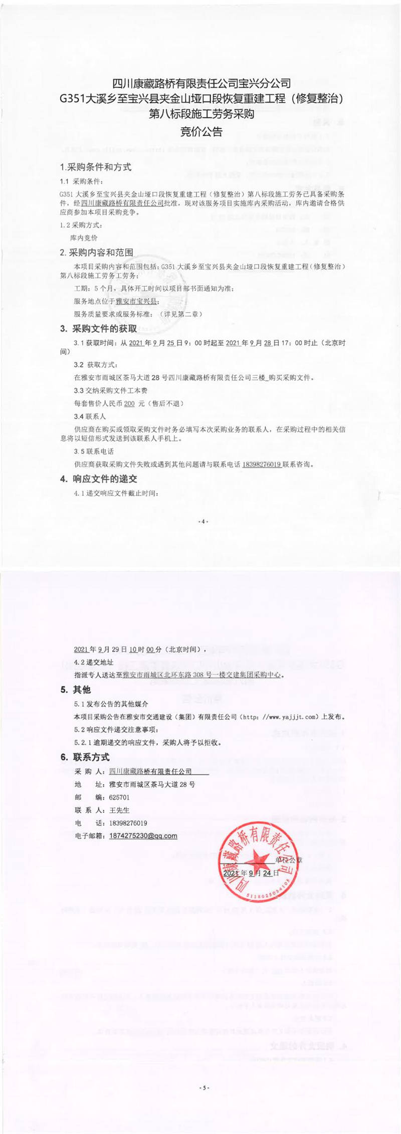 四川康藏路橋有限責(zé)任公司寶興分公司G351大溪鄉(xiāng)至寶興縣夾金山埡口段恢復(fù)重建工程(修復(fù)整治)第八標段施工勞務(wù)采購競價公告