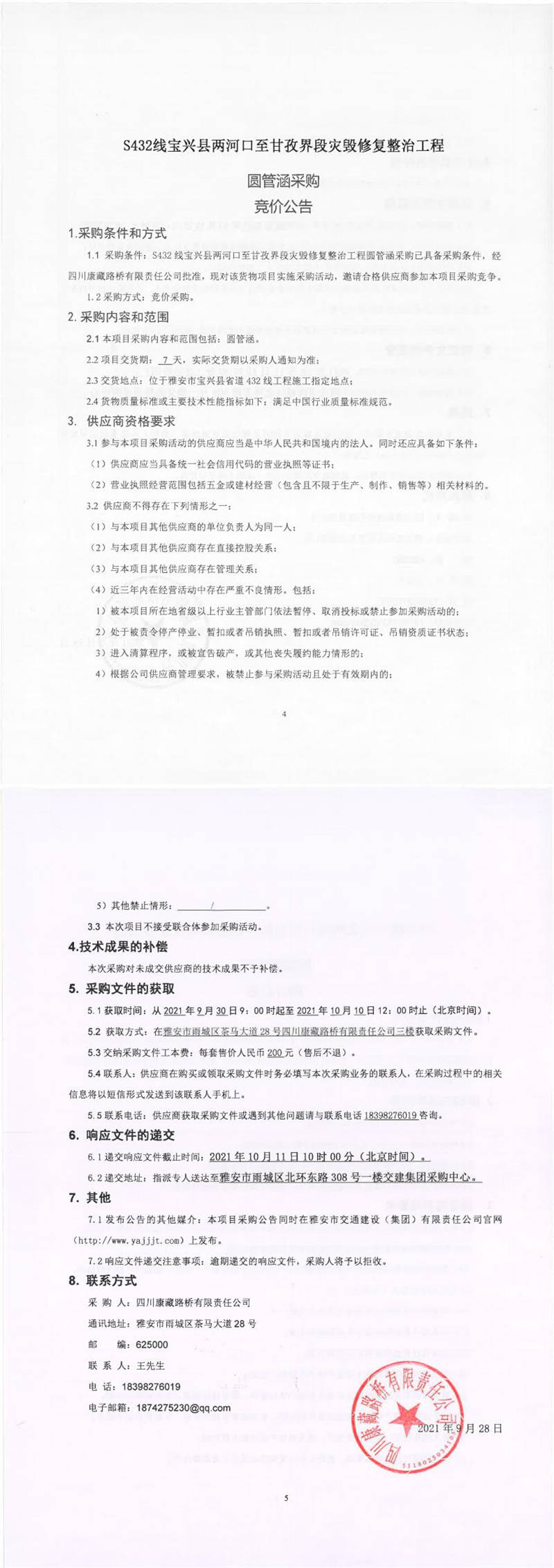 四川康藏路橋有限責任公司S432線寶興縣兩河口至甘孜界段災(zāi)毀修復(fù)整治工程圓管涵采購競價公告