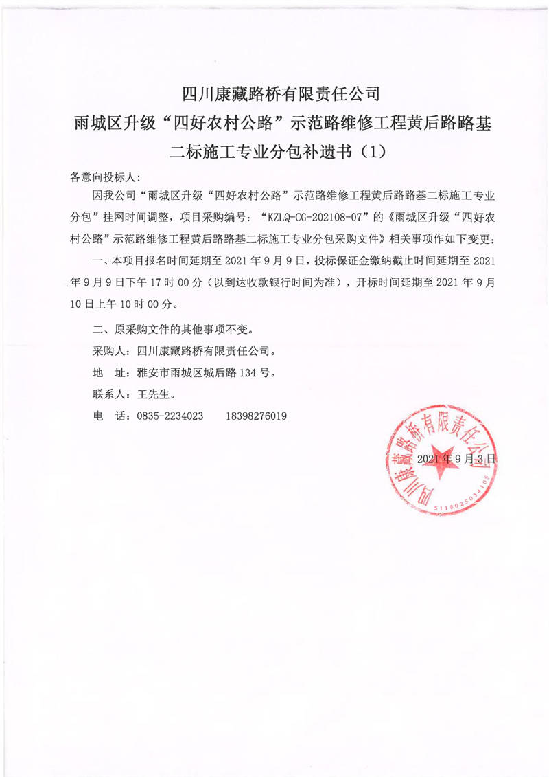 四川康藏路橋有限責(zé)任公司雨城區(qū)升級“四好農(nóng)材公路”示范路維修工程黃后路路基二標(biāo)施工專業(yè)分包補(bǔ)遺書(1)