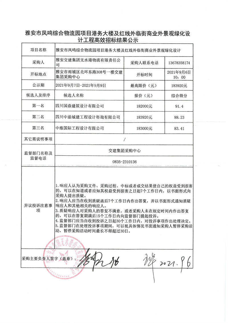 雅安交建集團(tuán)無(wú)水港物流有限責(zé)任公司雅安市鳳鳴綜合物流園項(xiàng)目港務(wù)大樓及紅線外臨街商業(yè)外景觀綠化設(shè)計(jì)工程高效招標(biāo)結(jié)果公示