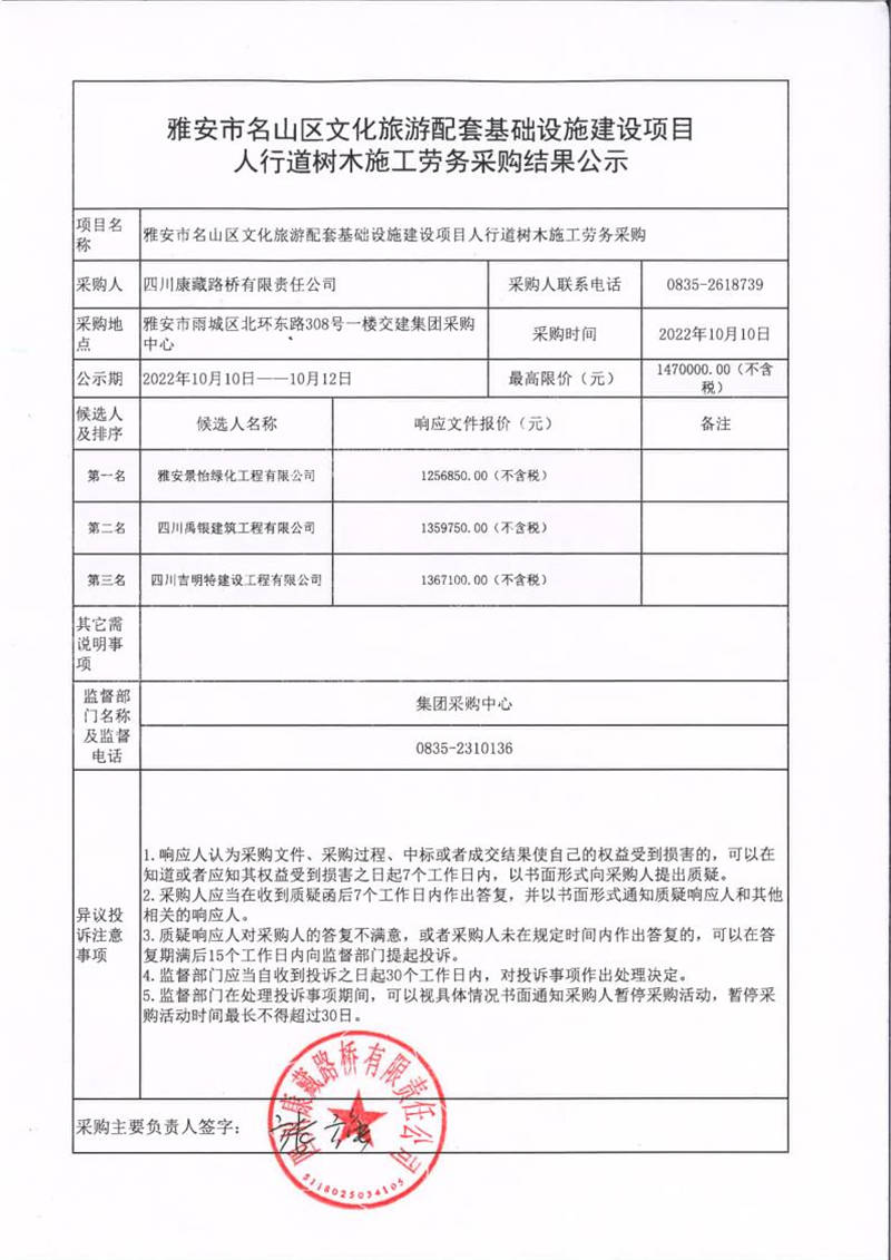 四川康藏路橋有限責(zé)任公司雅安市名山區(qū)文化旅游配套基礎(chǔ)設(shè)施建設(shè)項目人行道樹木施工勞務(wù)采購結(jié)果公示