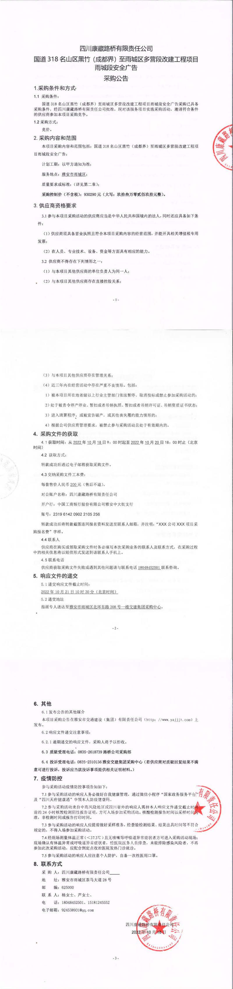 四川康藏路橋有限責(zé)任公司國道318名山區(qū)黑竹(成都界)至雨城區(qū)多營段改建工程雨城段安全廣告采購公告