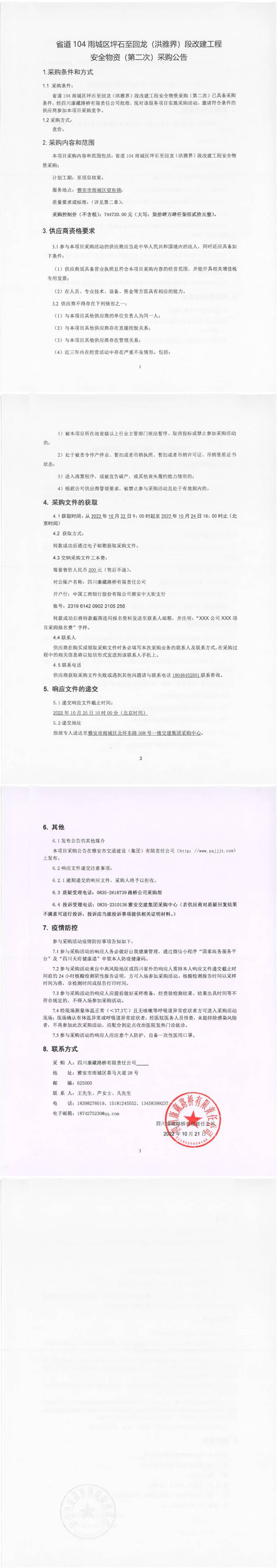 四川康藏路橋有限責(zé)任公司省道104雨城區(qū)坪石至回龍(洪雅界)段改建工程安全物資(第二次)采購(gòu)公告