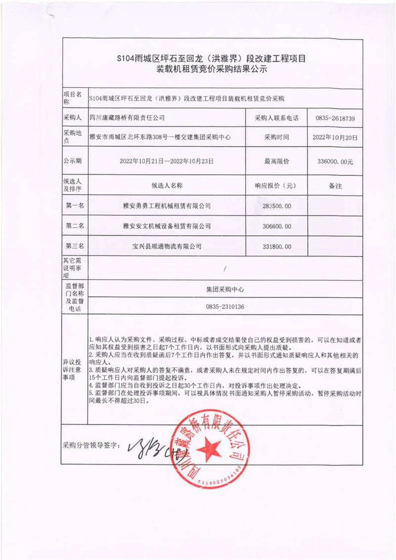 四川康藏路橋有限責(zé)任公司S104雨城區(qū)坪石至回龍(洪雅界)段改建工程項(xiàng)目裝載機(jī)租賃競(jìng)價(jià)采購(gòu)結(jié)果公示