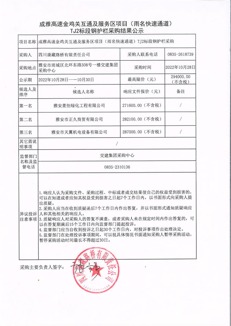 四川康藏路橋有限責(zé)任公司成都高速金雞關(guān)互通及服務(wù)區(qū)項目(雨名快速通道)TJ2標(biāo)段鋼護欄采購結(jié)果公示