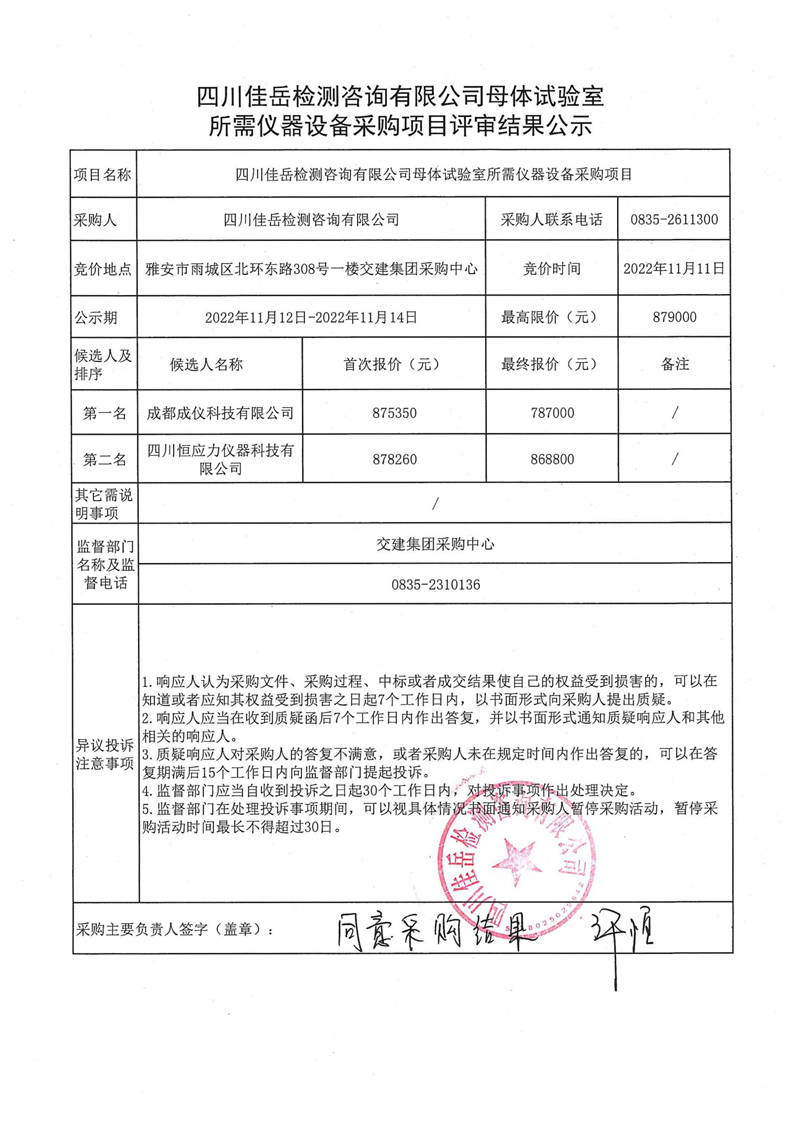 四川佳岳檢測(cè)咨詢有限公司母體試驗(yàn)室所需儀器設(shè)備采購(gòu)項(xiàng)目評(píng)審結(jié)果公示