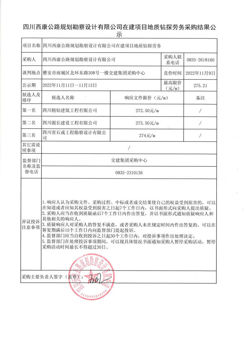 四川西康公路規(guī)劃勘察設計有限公司在建項目地質(zhì)鉆探勞務采購結(jié)果公示