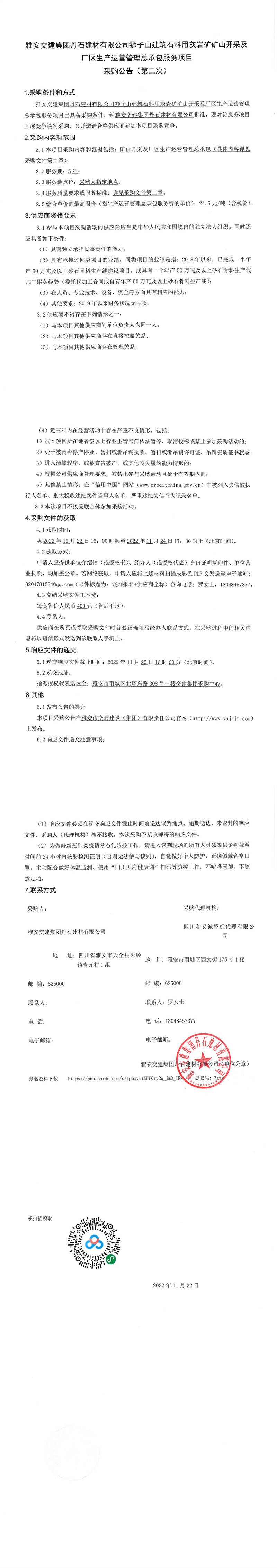 雅安交建集團丹石建材有限公司獅子山建筑石料用灰?guī)r礦礦山開采及廠區(qū)生產(chǎn)運營管理總承包服務項目采購公告(第二次)