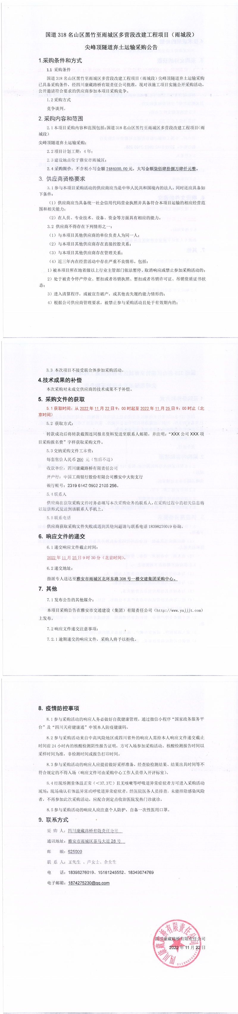 四川康藏路橋有限責(zé)任公司國道318名山區(qū)黑竹至雨城區(qū)多營段改建工程項(xiàng)目(雨城段)尖峰頂隧道棄土運(yùn)輸采購公告