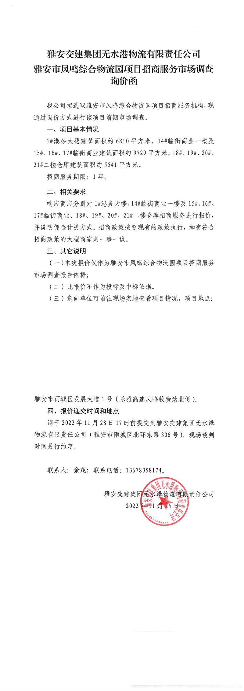 雅安交建集團無水港物流有限責任公司雅安市鳳鳴綜合物流園項目招商服務市場調(diào)查詢價函