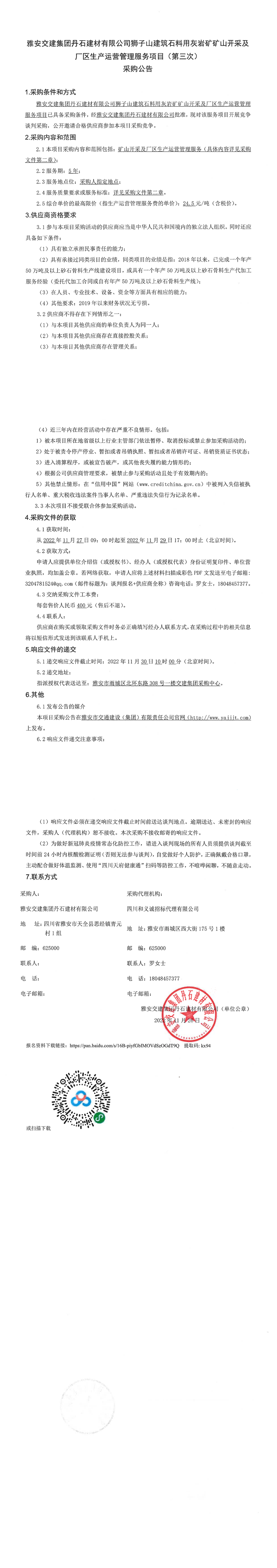雅安交建集團(tuán)丹石建材有限公司獅子山建筑石料用灰?guī)r礦礦山開(kāi)采及廠(chǎng)區(qū)生產(chǎn)運(yùn)營(yíng)管理服務(wù)項(xiàng)目(第三次)采購(gòu)公告