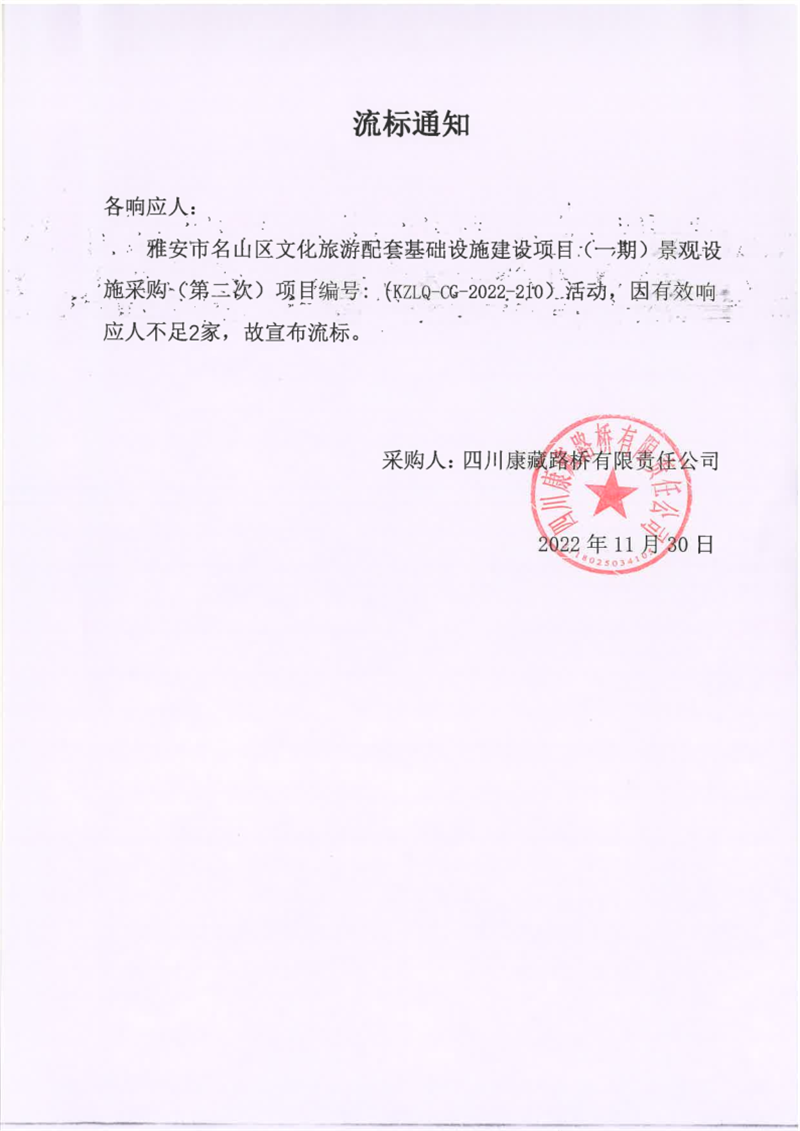 四川康藏路橋有限責(zé)任公司雅安市名山區(qū)文化旅游配套基礎(chǔ)設(shè)施建設(shè)項目(一期)景觀設(shè)施采購(第二次)流標通知