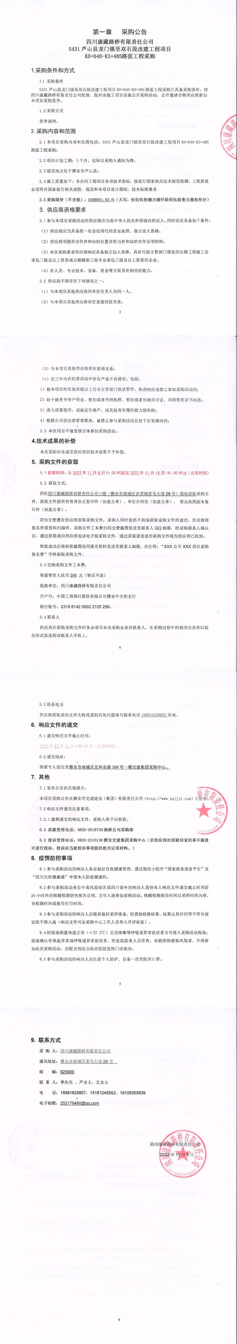 四川康藏路橋有限責任公司S431蘆山縣龍門鎮(zhèn)至雙石段改建工程項目K0+640-K3+485路面工程采購公告