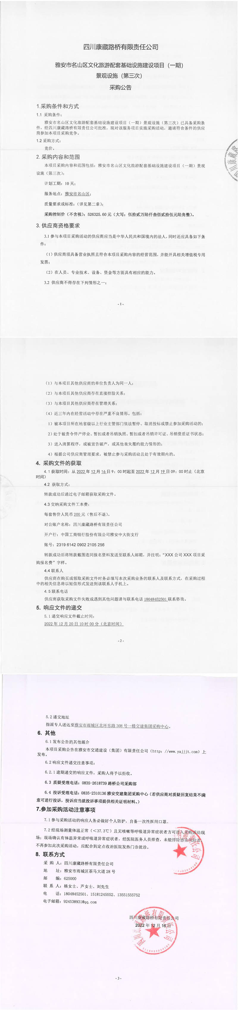 四川康藏路橋有限責(zé)任公司雅安市名山區(qū)文化旅游配套基礎(chǔ)設(shè)施建設(shè)項目(一期)景觀設(shè)施(第三次)采購公告