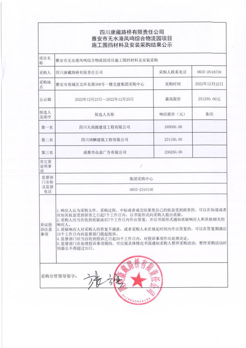 四川康藏路橋有限責任公司雅安市無水港鳳鳴綜合物流園項目施工圍擋材料及安裝采購結(jié)果公示