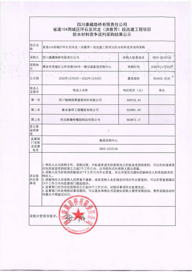 四川康藏路橋有限責任公司省道104雨城區(qū)坪石至回龍(洪雅界)段改建工程項目防水材料競爭談判采購結果公示