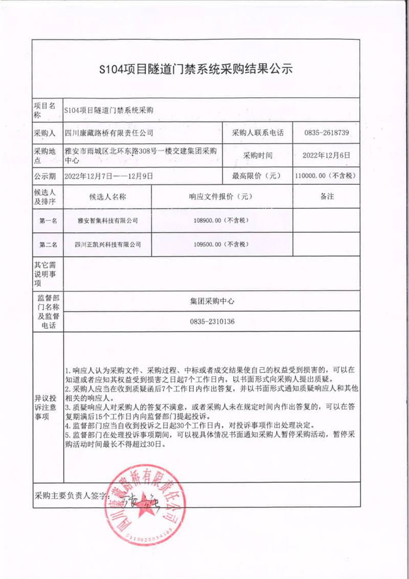 四川康藏路橋有限責(zé)任公司S104項(xiàng)目隧道門禁系統(tǒng)采購結(jié)果公示