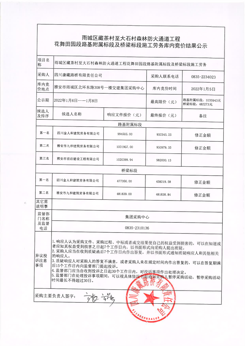 四川康藏路橋有限責任公司雨城雨城區(qū)藏茶村至大石村森林防火通道工程花舞田園段路基附屬標段及橋梁標段施工勞務(wù)庫內(nèi)競價結(jié)果公示
