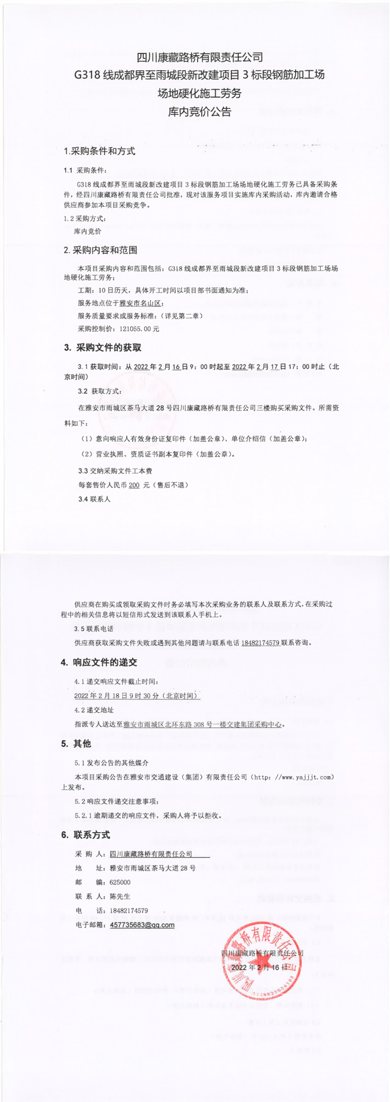 四川康藏路橋有限責(zé)任公司G318線成都界至雨城段新改建項(xiàng)目3標(biāo)段鋼筋加工場場地硬化施工勞務(wù)庫內(nèi)競價(jià)公告