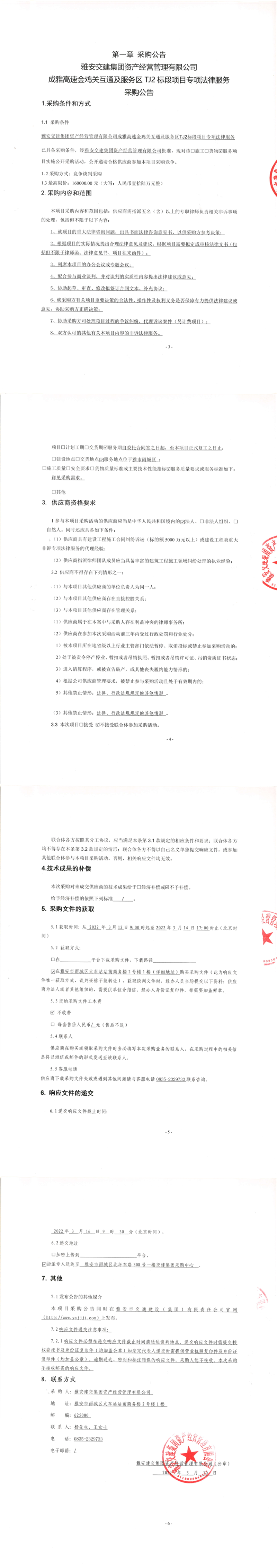 雅安交建集團資產經營管理有限公司成雅高速金雞關互通及服務區(qū)TJ2標段項目專項法律服務采購公告