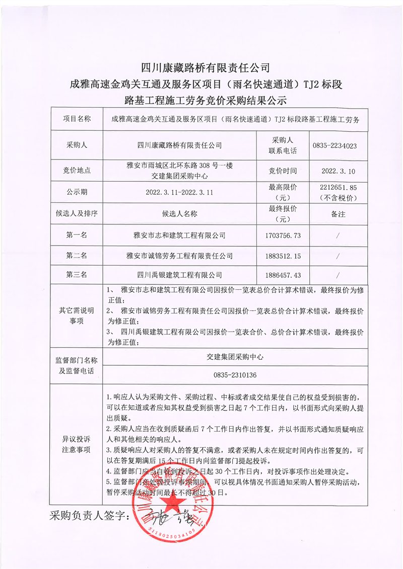四川康藏路橋有限責(zé)任公司成雅高速金雞關(guān)互通及服務(wù)區(qū)項目(雨名快速通道)TJ2標段路基工程施工勞務(wù)競價采購結(jié)果公示