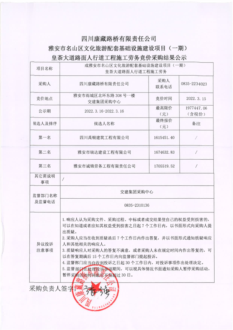 四川康藏路橋有限責(zé)任公司雅安市名山區(qū)文化旅游配套基礎(chǔ)設(shè)施建設(shè)項(xiàng)目(一期)皇茶大道路面人行道工程施工勞務(wù)競(jìng)價(jià)采購結(jié)果公示