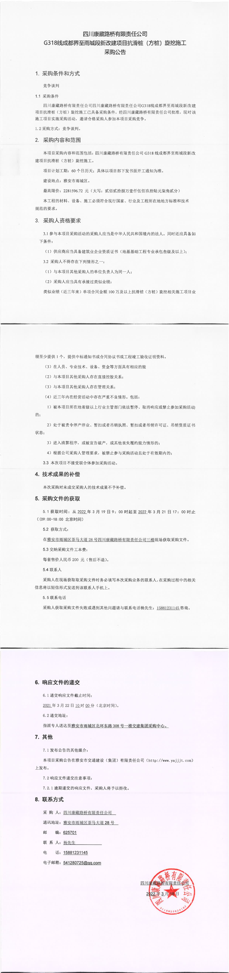 四川康藏路橋有限責(zé)任公司G318線成都界至雨城段新改建項(xiàng)目抗滑樁(方樁)旋挖施工采購公告