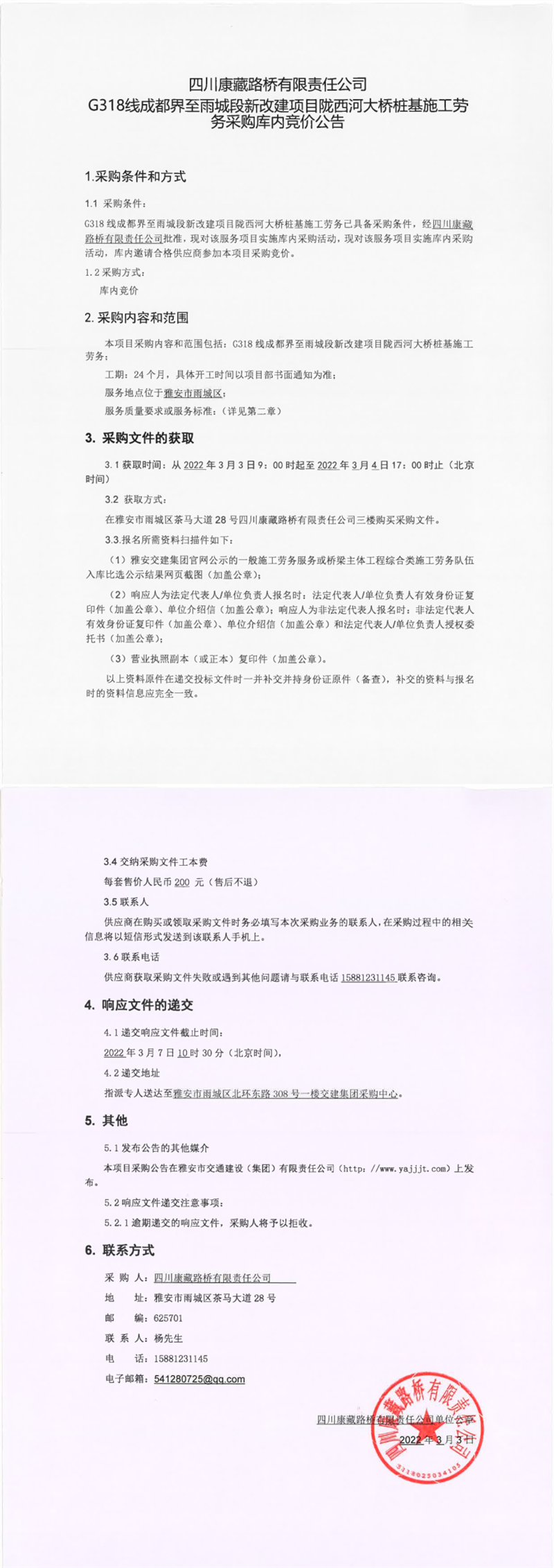 四川康藏路橋有限責任公司G318線成都界至雨城段新改建項目名山河大橋樁基施工勞務采購庫內(nèi)競價公告