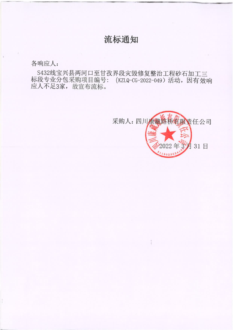 四川康藏路橋有限責(zé)任公司S432線(xiàn)寶興縣兩河口至甘孜界段災(zāi)毀修復(fù)整治工程砂石加工三標(biāo)段專(zhuān)業(yè)分包采購(gòu)項(xiàng)目流標(biāo)通知