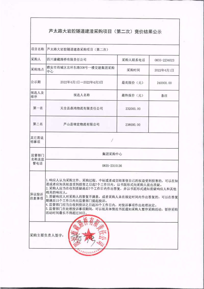 四川康藏路橋有限責(zé)任公司蘆太路大巖腔隧道建渣采購(gòu)項(xiàng)目(第二次)競(jìng)價(jià)結(jié)果公示