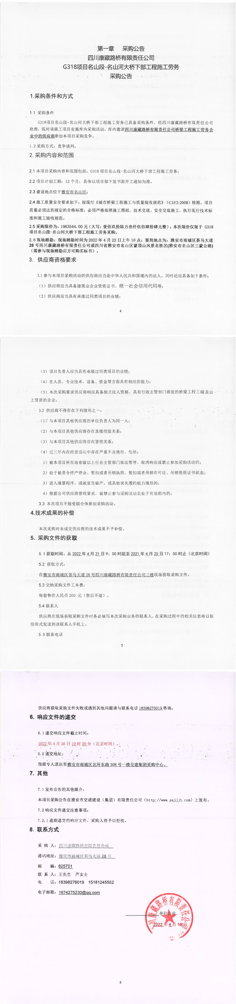 四川康藏路橋有限責(zé)任公司G318項(xiàng)目名山段-名山河大橋下部工程施工勞務(wù)采購公告