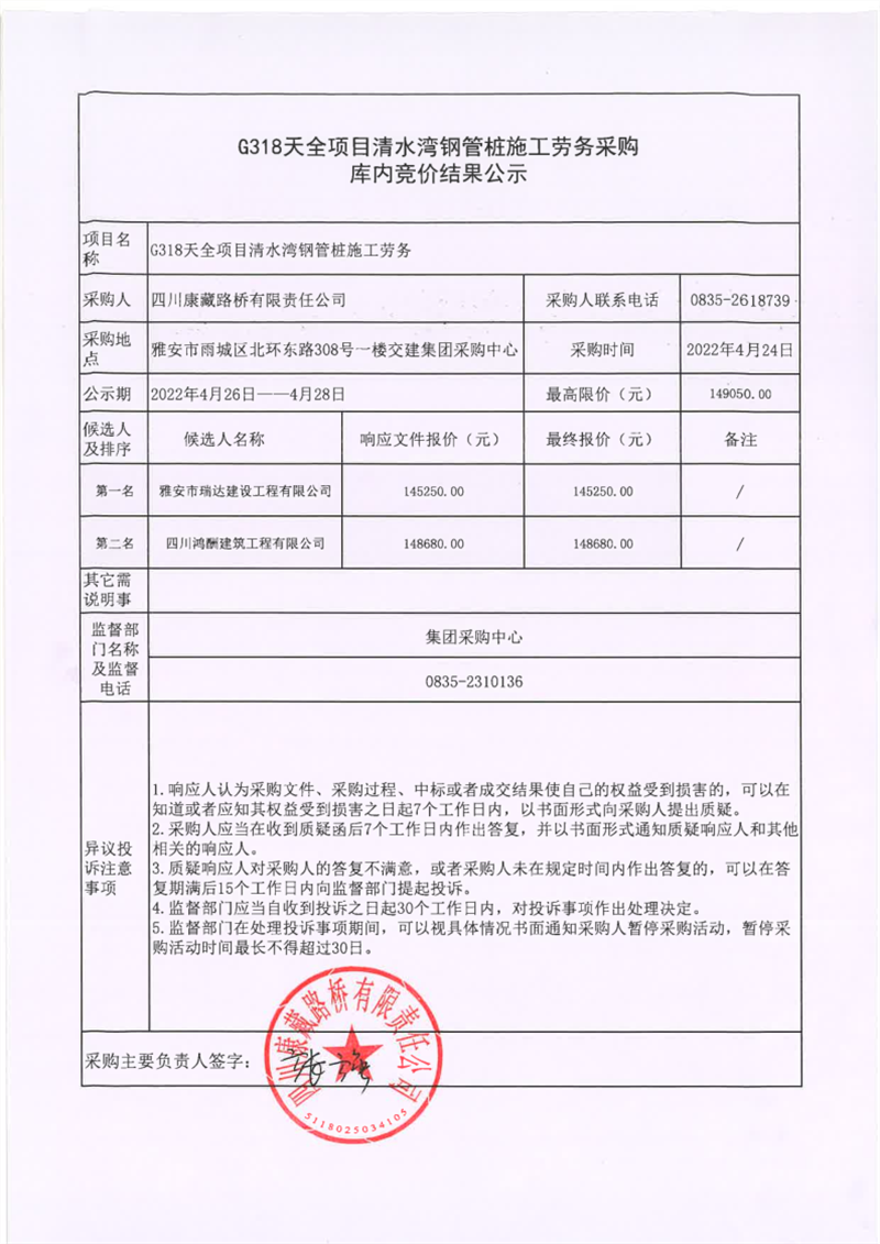 四川康藏路橋有限責(zé)任公司G318天全項(xiàng)目清水灣鋼管樁施工勞務(wù)采購庫內(nèi)競(jìng)價(jià)結(jié)果公示