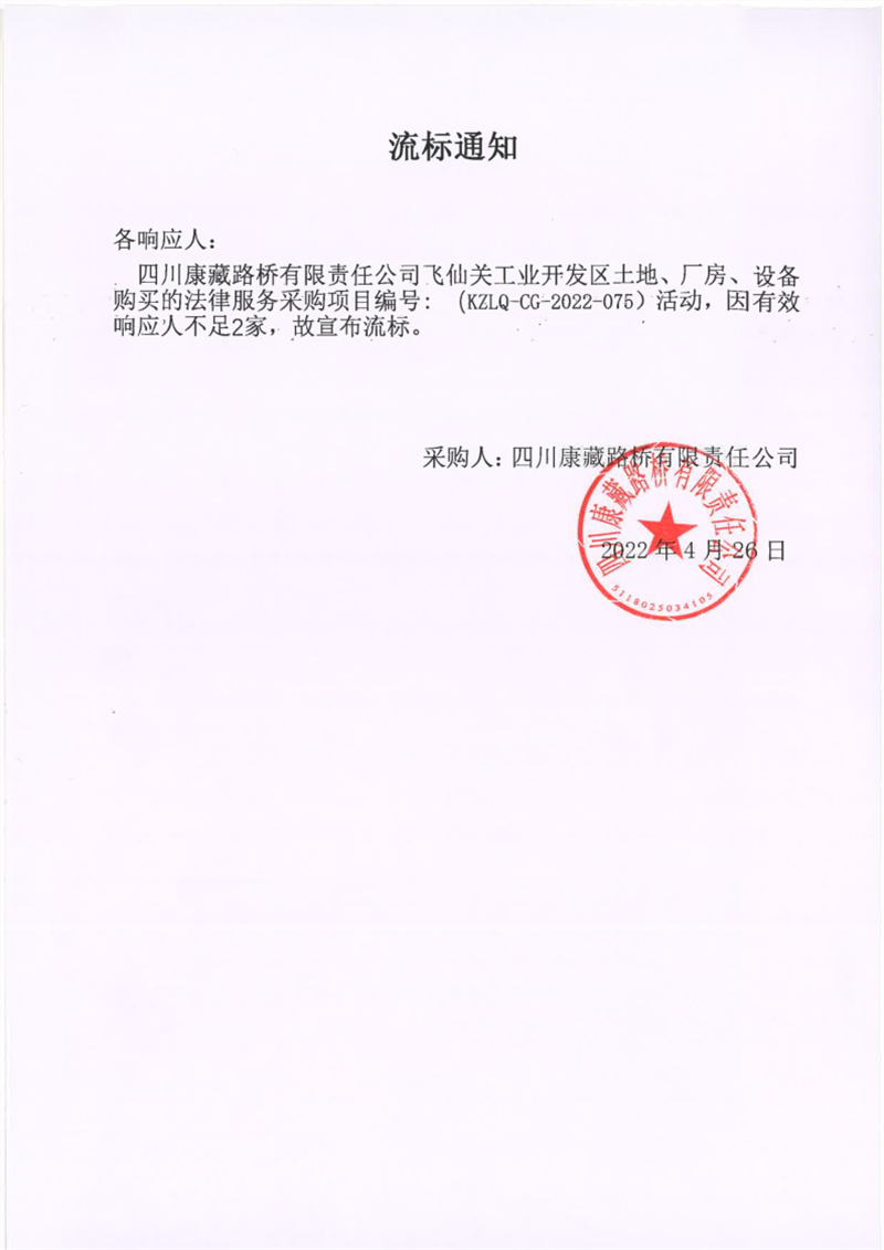 四川康藏路橋有限責任公司飛仙關工業(yè)開發(fā)區(qū)土地、廠房、設備購買的法律服務采購項目流標通知