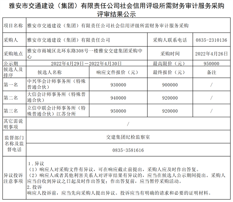 雅安市交通建設(shè)(集團(tuán))有限責(zé)任公司社會信用評級所需財(cái)務(wù)審計(jì)服務(wù)采購評審結(jié)果公示