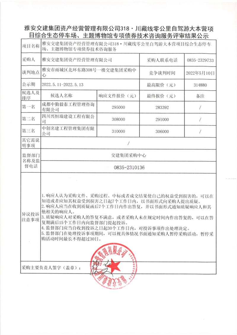 雅安交建集團(tuán)資產(chǎn)經(jīng)營管理有限公司318·川藏線零公里自駕游大本營項(xiàng)目投資價(jià)值分析及未來收益論證服務(wù)評審結(jié)果公示
