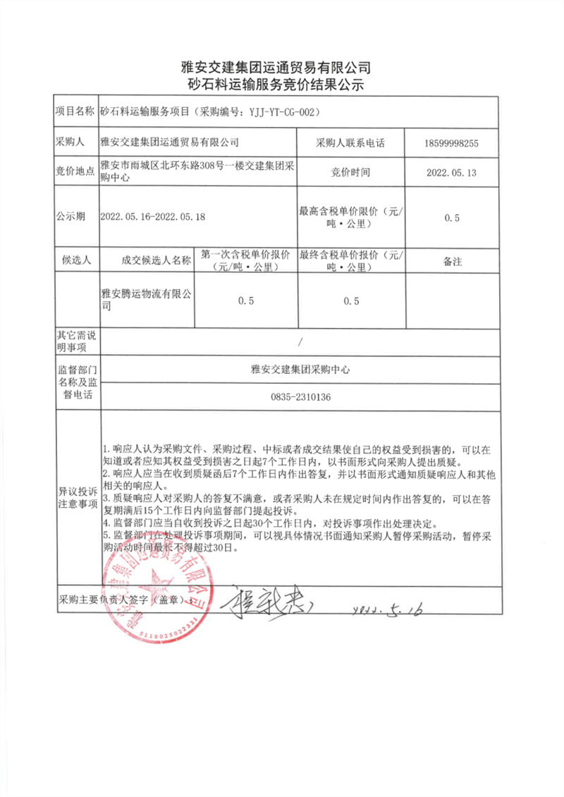 雅安交建集團運通貿易有限公司砂石料運輸服務競價結果公示