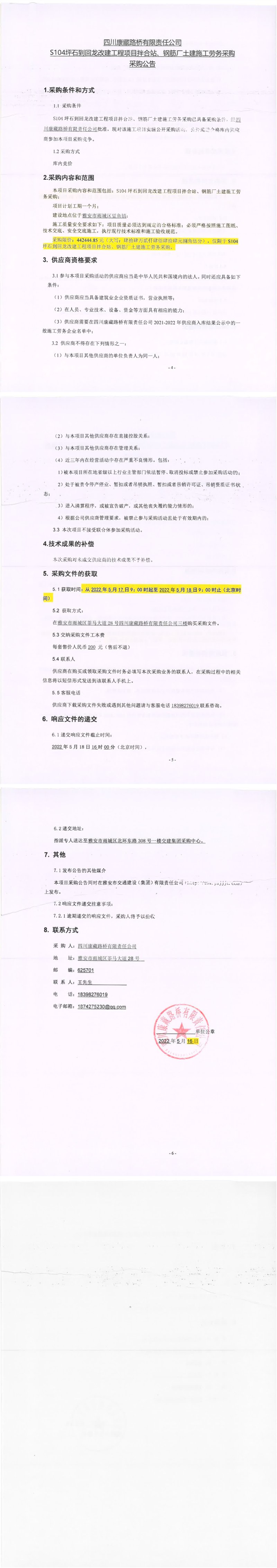 四川康藏路橋有限責任公司S104坪石到回龍改建工程項目拌合站、鋼筋廠土建施工勞務采購采購公告