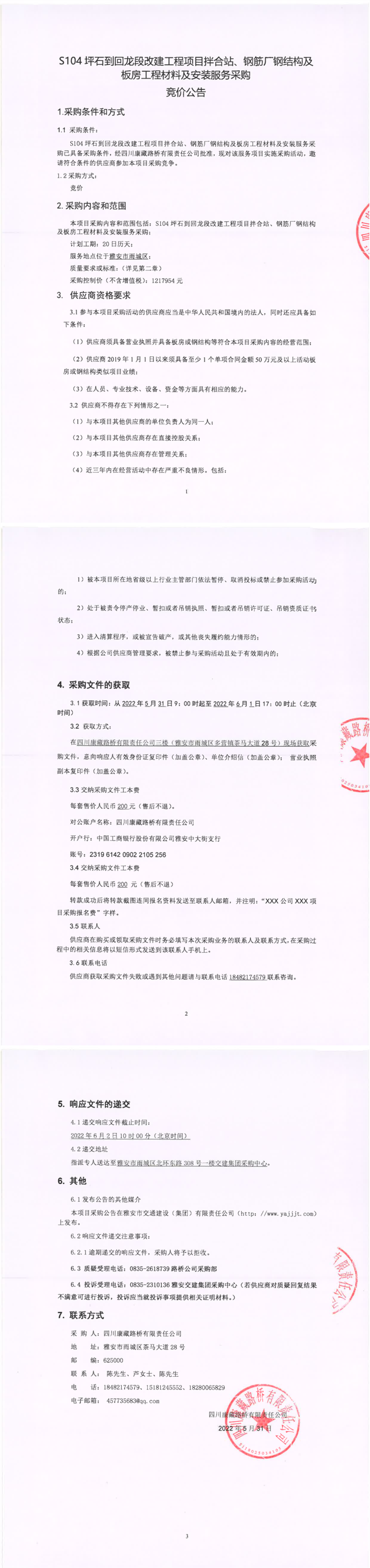 四川康藏路橋有限責(zé)任公司S104坪石到回龍段改建工程項(xiàng)目拌合站、鋼筋廠鋼結(jié)構(gòu)及板房工程材料及安裝服務(wù)采購(gòu)競(jìng)價(jià)公告