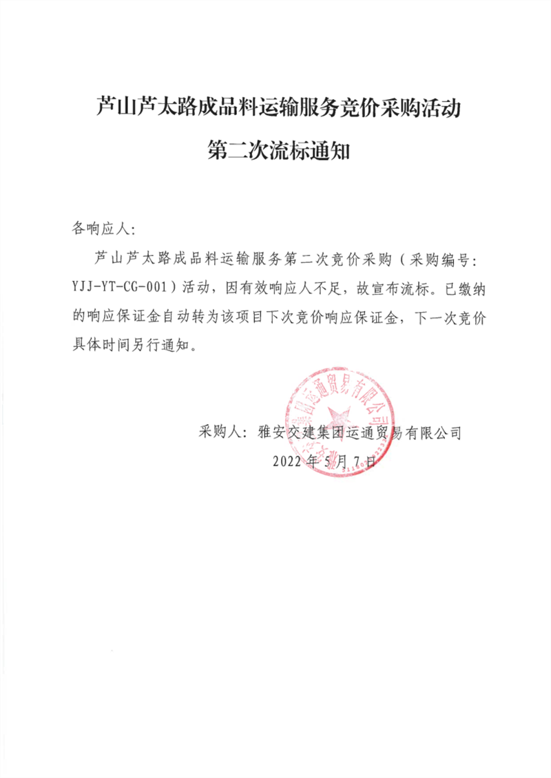 雅安交建集團運通貿(mào)易有限公司蘆山蘆太路成品料運輸服務競價采購活動第二次流標通知