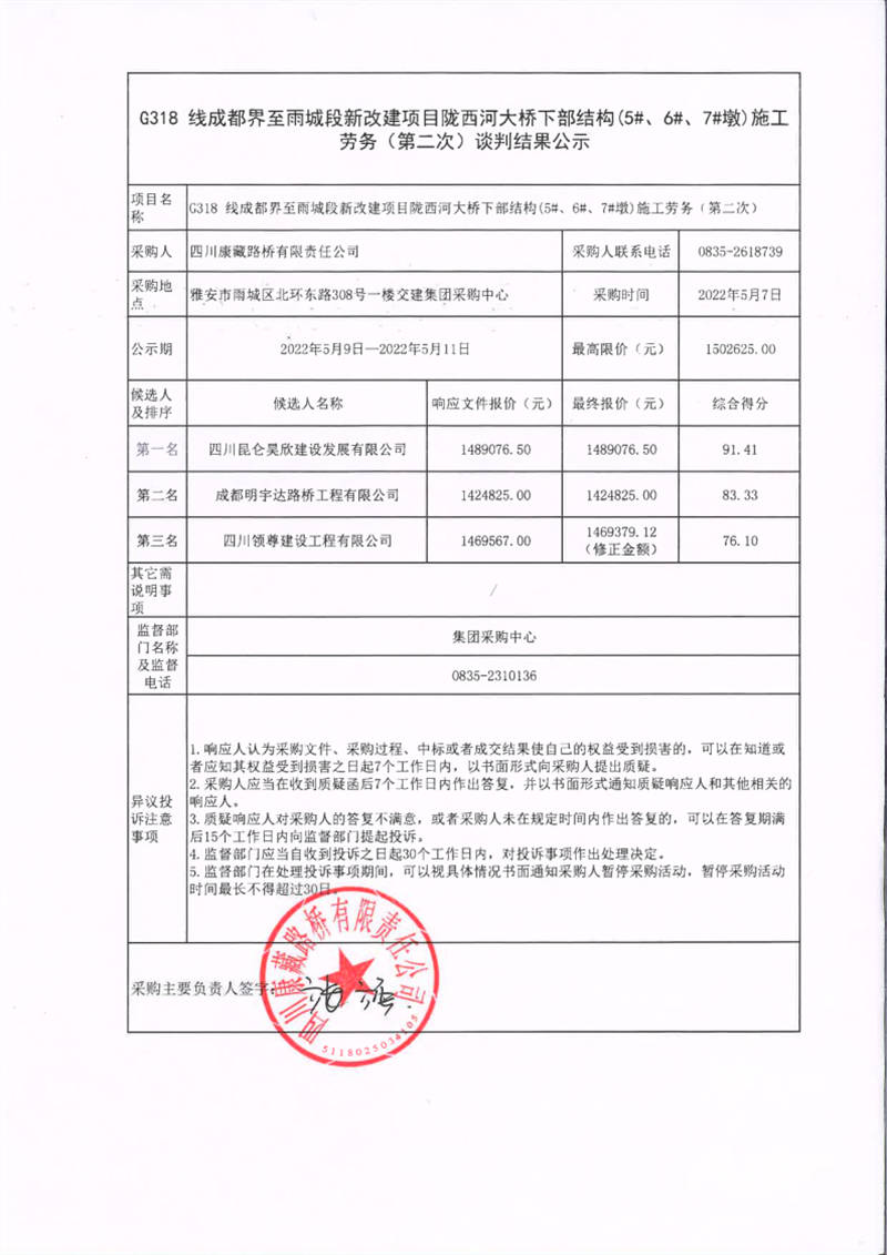 四川康藏路橋有限責(zé)任公司G318線成都界至雨城段新改建項目隴西河大橋下部結(jié)構(gòu)(5#、6#、7#墩)施工勞務(wù)(第二次)談判結(jié)果公示
