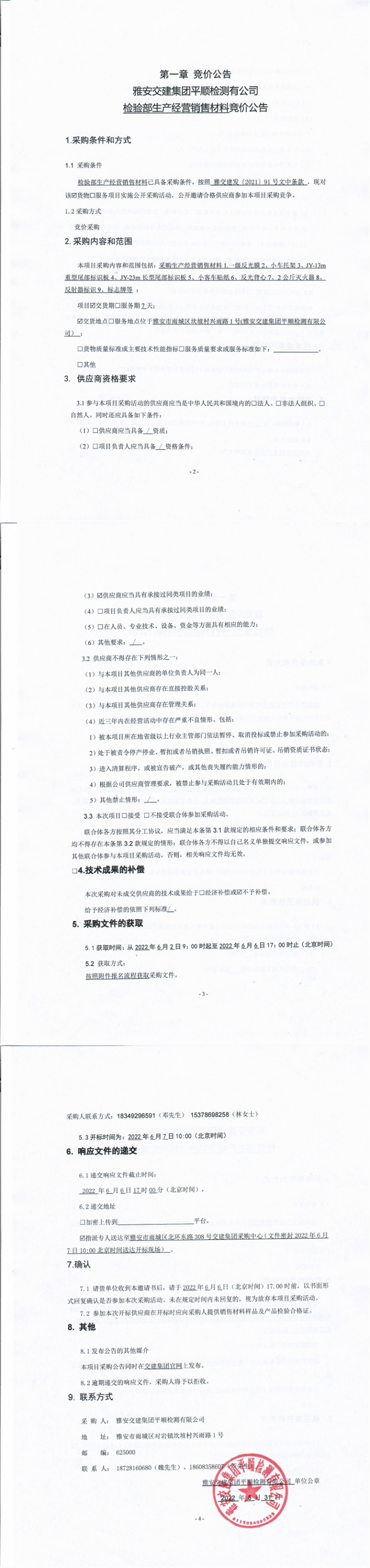 雅安交建集團平順檢測有限公司檢驗部生產經營銷售材料競價公告