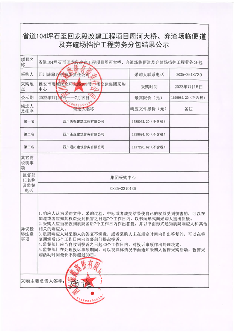 四川康藏路橋有限責(zé)任公司省道104坪石至回龍段改建工程項目周河大橋、棄渣場臨便道及棄碴場擋護(hù)工程勞務(wù)分包結(jié)果公示