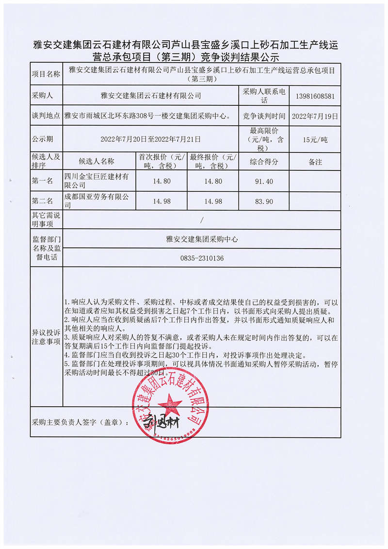 雅安交建集團(tuán)云石建材有限公司蘆山縣寶盛鄉(xiāng)溪口上砂石加工生產(chǎn)線運(yùn)營總承包項(xiàng)目(第三期)競爭談判結(jié)果公示