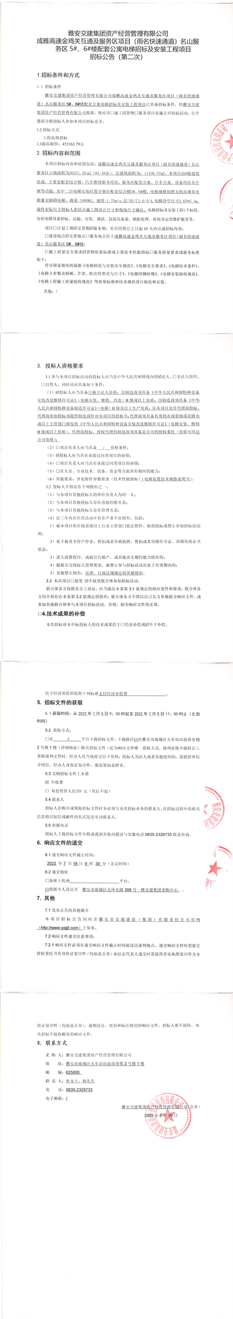 雅安交建集團(tuán)資產(chǎn)經(jīng)營(yíng)管理有限公司成雅高速金雞關(guān)互通及服務(wù)區(qū)項(xiàng)目(雨名快速通道)名山服務(wù)區(qū)5#、6#樓配套公寓電梯招標(biāo)及安裝工程項(xiàng)目招標(biāo)公告(第二次)