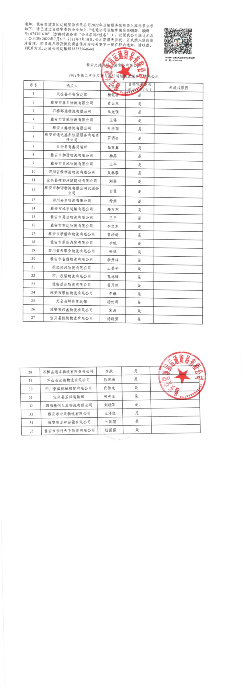雅安交建集團(tuán)運(yùn)通貿(mào)易有限公司2022年第二次供應(yīng)商入庫(kù)(運(yùn)輸物流服務(wù))結(jié)果公示