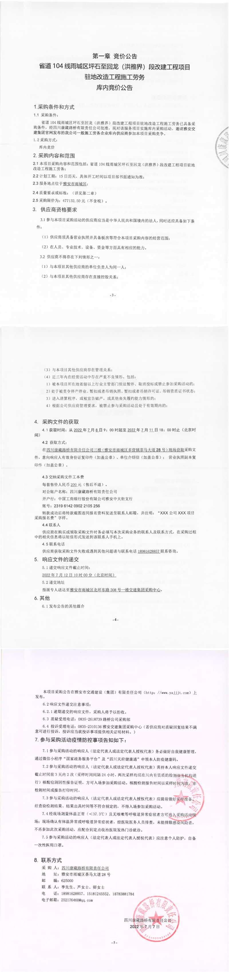 四川康藏路橋有限責(zé)任公司省道104線雨城區(qū)坪石至回龍(洪雅界)段改建工程項目駐地改造工程施工勞務(wù)庫內(nèi)競價公告