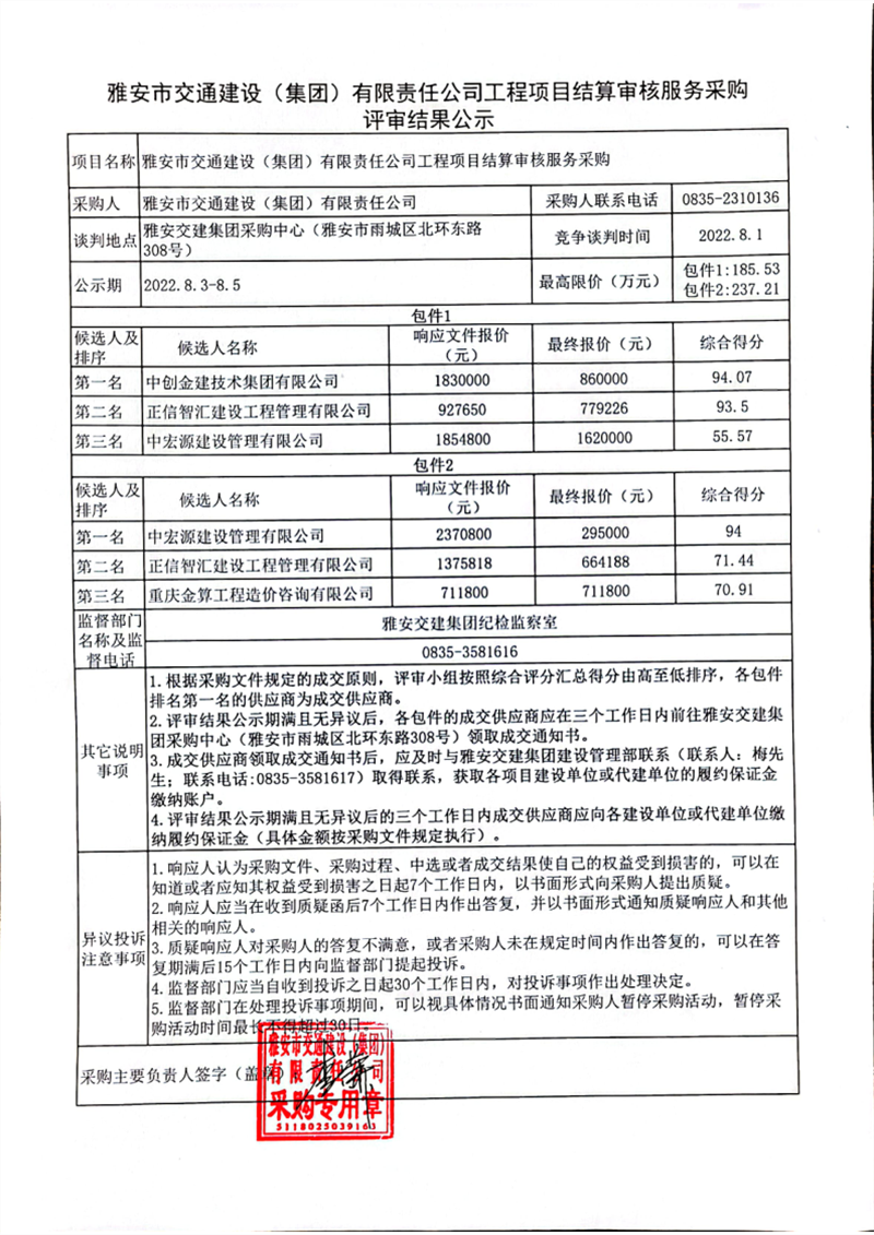 雅安市交通建設(shè)(集團)有限責任公司工程項目結(jié)算審核服務(wù)采購評審結(jié)果公示