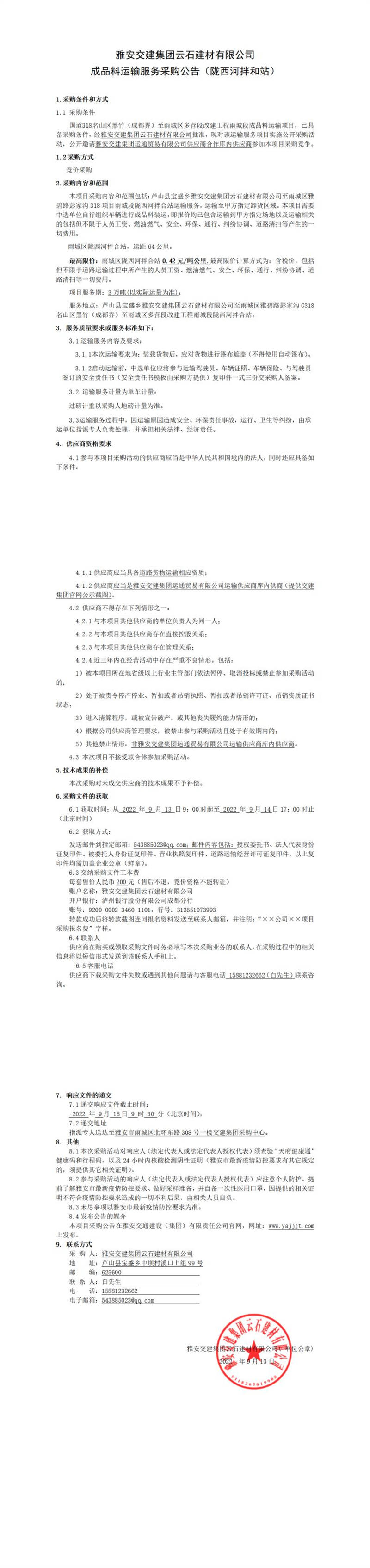 雅安交建集團(tuán)云石建材有限公司成品料運(yùn)輸服務(wù)采購公告(皇茶大道拌和站)
