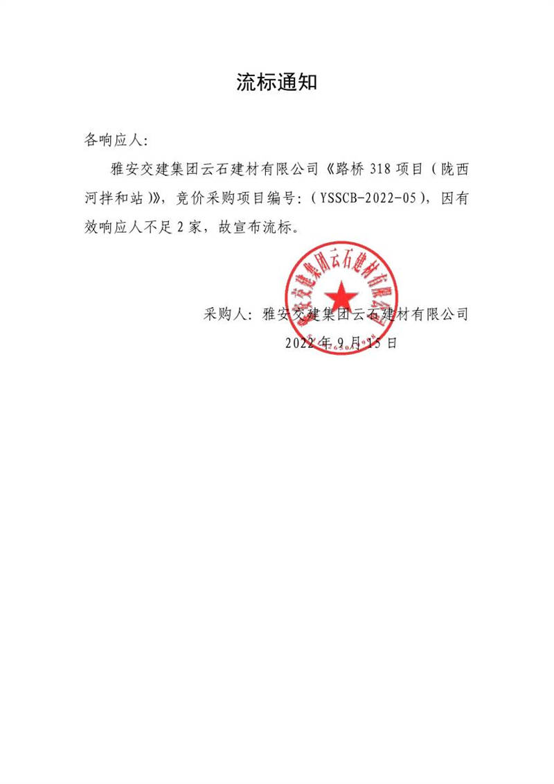 雅安交建集團云石建材有限公司成品料運輸服務(wù)采購(皇茶大道拌和站)流標(biāo)通知