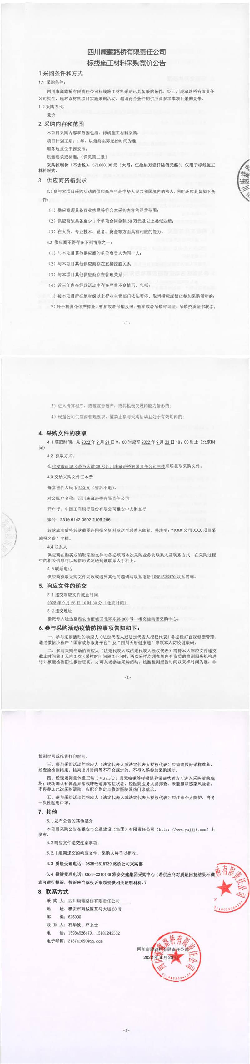 四川康藏路橋有限責任公司標線施工材料采購競價公告